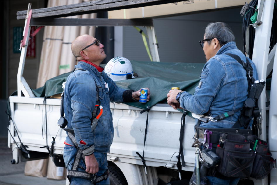 太陽に近い屋根の上で働く職人にとって、水分補給は命を守る大切なこと。飲み物は会社が全額負担し、いつでも自由に飲めるようにしています。